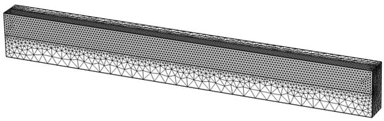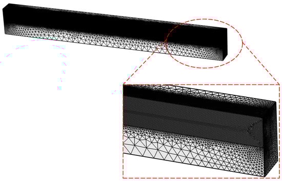 To ensure the robustness and reliability of the results, we conducted a grid independence verification of the model. A coarser grid was applied to our model to compare the research results obtained with the finer mesh described earlier. It consisted of 30,000 mesh elements, while the finer grid contained 330,000 grid elements. The coarser grid model is shown in Figure 7.