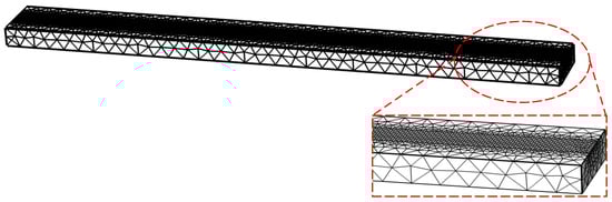The central part of the build surface is the electron beam heating area, where the temperature will change drastically, so the mesh must be encrypted. The upper half of the symmetrical surface needs refinement to observe the cross-sectional morphology of the melt pool. Other areas require a coarser grid to reduce computational load. The refined area is set as the fluid computational domain and divided into tetrahedral grids. Compared to the grids in the regular physical computational domain, the grids in the fluid computational domain are finer and more uniform, with smaller computational errors when the maximum grid cell size and maximum grid growth rate are small. The structure and grid division of the heat conduction model are shown in Figure 3 and Figure 4. The model parameters are provided in Table 2.