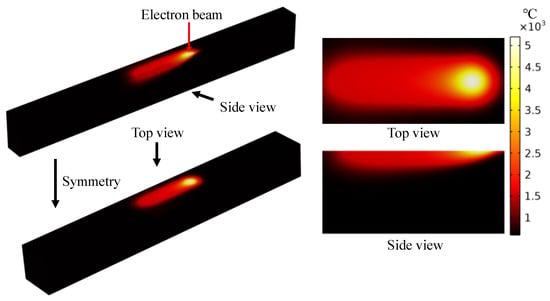 - The electron beam heating process is intense, while the subsequent cooling after scanning is slow, leading to a slow formation of the melt pool from top to bottom. Moreover, with an increase in scanning speed, the solid–liquid boundary in front of the molten pool becomes shallower.