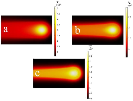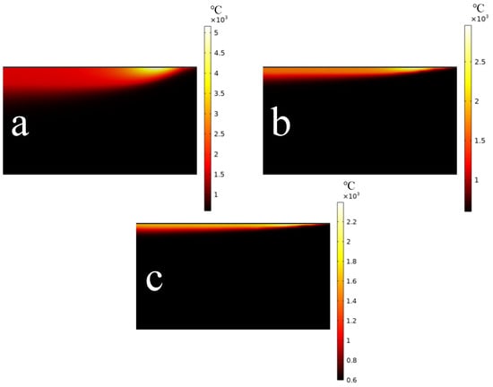 The local temperature field distribution map of the symmetrical cross-section at different speeds (a) 1000 mm/s; (b) 5000 mm/s; (c) 10,000 mm/s.