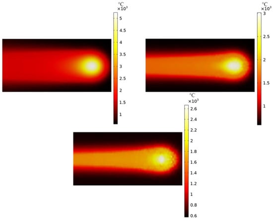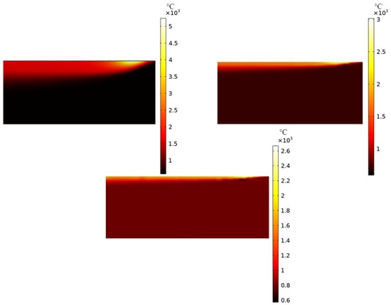 Figure 9 shows the changes in melt pool morphology with electron beam moving speeds of 1000 mm/s, 5000 mm/s, and 10,000 mm/s under identical conditions. From the graph, we can see that as the scanning speed increases, the trailing edge of the high-temperature region gradually lengthens, and the melt pool length increases. In addition, the shape of the electron beam heating section transitions from elliptical to droplet-shaped. This transition occurs because the downward conduction of temperature on the powder bed requires some time. The higher scanning speed causes the temperature applied by the electron beam on the surface to not rapidly conduct to the lower layers, resulting in the elongation of the high-temperature region’s trailing edge and melt pool length. Furthermore, as the scanning speed increases, the temperature applied by the electron beam on the surface fails to quickly spread to the sides, leading to insufficient heating of the powder bed by the electron beam and the formation of a droplet shape. The measured melt pool lengths are 170 um at 1000 mm/s, 192 um at 5000 mm/s, and 216 um at 10,000 mm/s. These results reveal the intricate interplay between scanning speed, heat conduction, and molten pool characteristics.