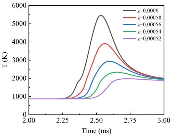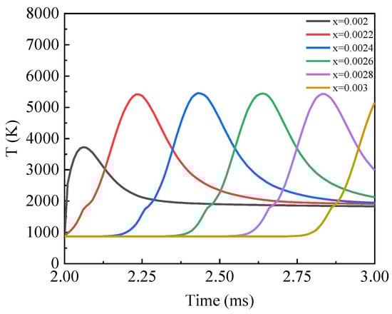 Figure 11 shows when v = 1000 mm/s, the temperature at the upper boundary of the symmetric plane x = 0.002, x = 0.0022, x = 0.0024, x = 0.0026, x = 0.0028, and x = 0.003 changes over time. It can be observed that the temperature at each position changes as the electron beam center moves. As the electron beam approaches the designated position, the temperature begins to rise rapidly, leading to localized heating and melting. During the temperature increase, there is a small fluctuation, during which the temperature is within the solid–liquid phase transition temperature range, causing the solid metal powder to absorb heat and melt, forming a molten pool. When the electron beam reaches the designated position, the temperature reaches its peak. As the electron beam moves past the designated position, the temperature gradually begins to decrease, ultimately stabilizing at around 2000 K. From the graph, it is evident that the heating efficiency during the temperature rise process is significantly higher than the cooling efficiency during the temperature decrease process. This indicates that electron beam heating and melting are a rapid process, while subsequent cooling and solidification are a relatively slow process.