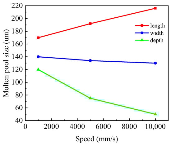 Figure 15 shows the overall size of the melt pool as a function of scanning speed at v = 1000 mm/s, v = 5000 mm/s, and v = 10,000 mm/s. It can be observed that as the scanning speed increases, the length of the melt pool also increases, with the growth rate approaching a straight line. At v = 5000 mm/s, the length of the melt pool is close to twice the diameter of the electron beam. Furthermore, with increasing scanning speed, the width and depth of the melt pool decrease, but the decrease in width is not significant, remaining at around 140 µm. Therefore, when scanning multiple scan lines, to ensure the density of the printed sample, the spacing between adjacent scan lines must be less than the width of the melt pool under the corresponding speed. The depth of the melt pool is significantly influenced by the scanning speed, but as the speed increases, the rate of change decreases. This is because the electron beam energy has strong penetrative properties; once applied to the surface of the powder bed, it penetrates to a certain depth. When the depth of the melt pool decreases to near this penetration depth, the rate of change significantly decreases, ultimately approaching the penetration depth infinitely closely. This differs from the results of Chen. In Chen [28] et al.’s results, the length of the molten pool decreases with increasing scanning speed, while the width and depth decrease with increasing scanning speed. This is mainly because he took into account the powder layer in the article, and his line energy density is different from that in this paper; the trend of the length change of the molten pool is also different.
