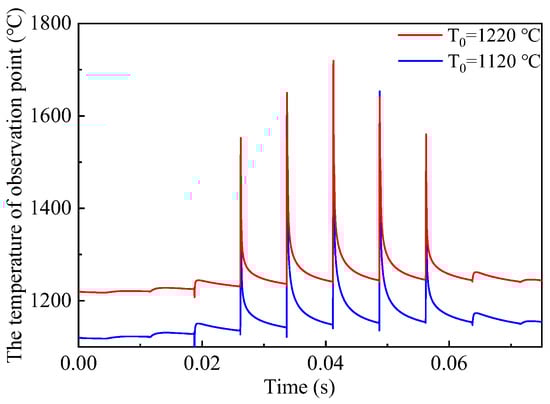 Figure 17 shows the effect of different initial temperatures on the temperature field during the scanning process. It can be seen from the figure that starting from 1220 °C and lowering to 1120 °C, the overall temperature at the observation point during the scanning process decreases by around 100 °C, and the temperature difference becomes smaller as the scanning progresses. In general, the initial temperature has a greater influence on the temperature field of the scanning process.
