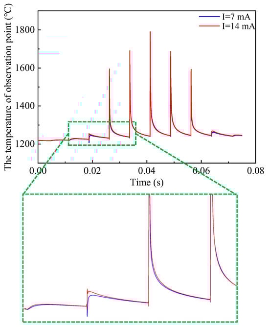 Figure 18 shows the effect of different electron beam current values on the temperature field during the scanning process. It can be seen the change in the current value does not have a great impact on the temperature of the measurement point. When I = 7 mA, the maximum temperature reached by the measurement point is 1720 °C; when I = 14 mA, the maximum temperature reached by the measurement point is 1790 °C. The current is twice as large as the original, but the maximum temperature is only 70 °C short.