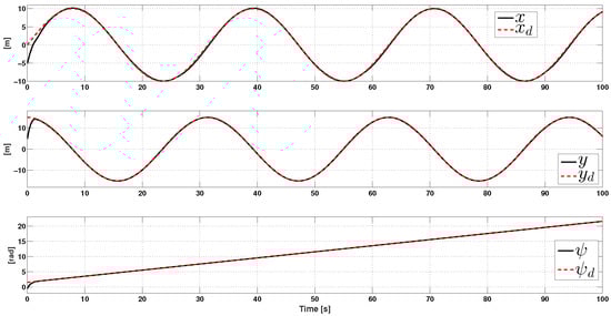 In this section, we apply Proposition 1 to control the model (3). To this end, we consider that the desired trajectories , , and are bounded. Let us now define the tracking error as . Once again, we define the auxiliary variable as