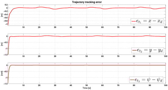 for . The outcome of this experiment can be seen in Figure 2, Figure 3, Figure 4 and Figure 5. In Figure 2, we show actual and desired positions . This figure shows that the desired position coordinates are reached at close to 5, 2, and 1 s, respectively. At the same time, the corresponding tracking errors are shown in Figure 3, where we can see that these errors are confined in a small neighborhood of zero. We present the input torques in Figure 4. This figure shows smooth behavior, a low control effort, and, due to the approximation in (30), the absence of the undesired chattering phenomena as a result. Finally, in Figure 5, we show the phase portrait plotter to give a concise image of the vessel maneuver. Additionally, in this figure, we can see that our control strategy effectively accomplishes the control task. We underscore that, to avoid the chattering phenomena, we filter the control effort by the first order low pass filter . It is worth mentioning that the filtered controllers have the form of the reference signals with their respective perturbations. That is, these controllers counteract the effect of the undesirable perturbation. In addition, we can see that all signals reach the reference in a very small vicinity in a very short time.