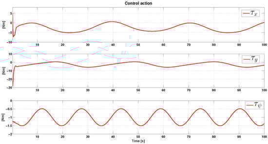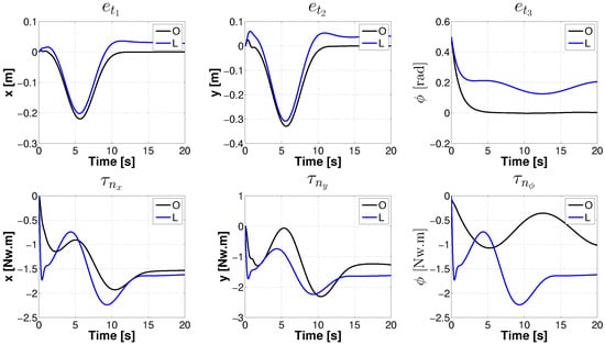 From the same simulation, we show in Figure 7 the tracking errors and the control actions of the closed loops of the O and L control strategies. Please note that to avoid the chattering phenomena and be able to make a comparison, we filter the control effort of our control strategy O using the first order low pass filter . From the graphs in this figure, we can see that, when reaching the steady state, our control strategy performs better than the linearizing controller L, particularly in the performance of angle . Related to the controllers’ response, we can see that they have similar behaviors, except the controller that acts over the vessel angle, due to the bias term included in perturbation .