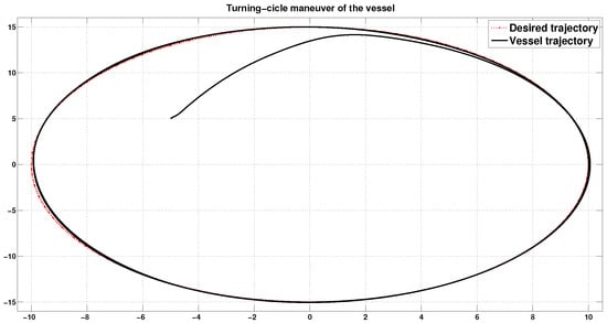 The first experiment: The task consists of a turning ellipse maneuver of the vessel, whose parameters are unknown. This experiment allows us to verify that the fast error converges to a small neighborhood of zero, as well as to verify the control law robustness against unmodeled, unmatched perturbations. In these simulations, the proposed ellipse trajectory is defined in the Earth’s fixed coordinate frame and centered around the origin. Then, we defined the reference trajectory as