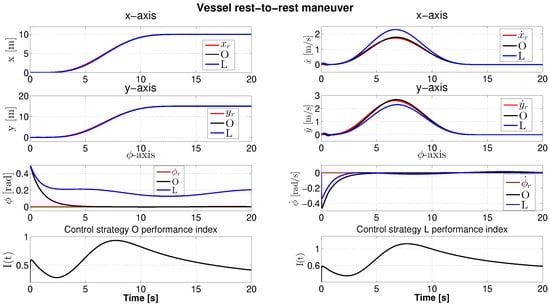 A comparison of the closed-loop responses of O and L control strategies when tracking a Bézier spline trajectory to carry out a rest-to-rest maneuver for the x and y axes.