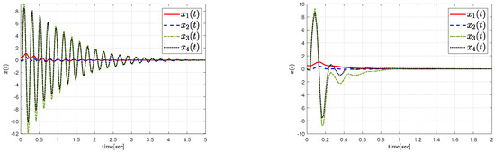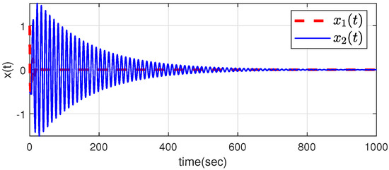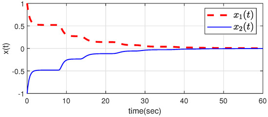 Table 6 lists the maximum delay bounds for various s, as determined by Theorems 1 and 2 and Corollary 1 as well as those of [41,42,43,44] when is unknown. It is listed in Table 6 that Theorems 1 and 2 provide larger delay bounds than those of [41,42,43,44]. To confirm the effectiveness of the proposed results, Figure 5 shows the system’s state trajectories for with the initial condition . Figure 5 shows that the state responses of the system (1) converge to zero as time goes to infinity.