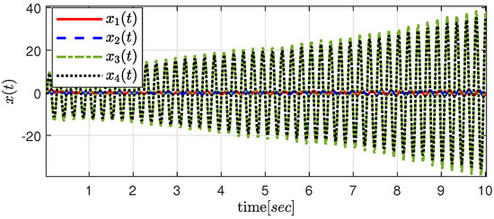 In Table 5, the maximum delay bounds for various s and s are shown using Theorems 1 and 2, and these are compared with [3]. To confirm the effectiveness of the proposed results, Figure 3 and Figure 4 show the system’s state trajectories for , , and with the initial condition . Figure 3 shows that the system is unstable when . In contrast, Figure 4 demonstrate that the system is asymptotically stable within the maximum delay bound obtained using Theorems 1 and 2.