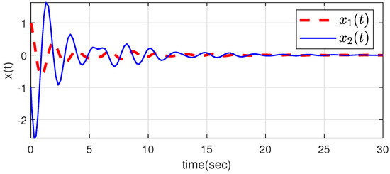 Table 1 and Table 2 list the maximum delay bounds for various s as determined by Theorems 1 and 2 and Corollary 1, as well as those of [3,14,38], when is 0.1 and 0.5, respectively. It is listed in Table 1 that Theorems 1 and 2 provide larger delay bounds than those of [3,14,38]. Additionally, Theorem 1 yields slightly larger delay bounds compared to Corollary 1. Table 2 also shows the superiority of Theorems 1 and 2 when . As a result, it can be confirmed that improved results can be obtained from the suggested Theorems 1 and 2. Figure 1 shows that the state responses of system (1) converge to zero as time goes to infinity.