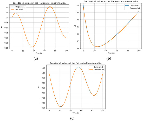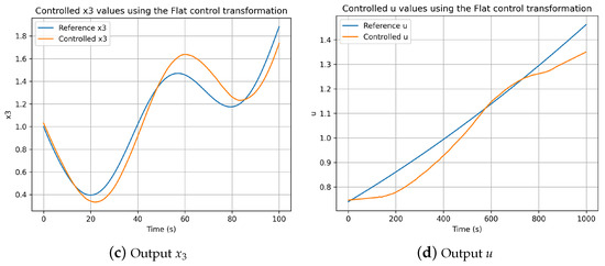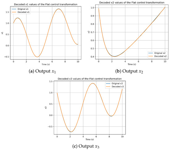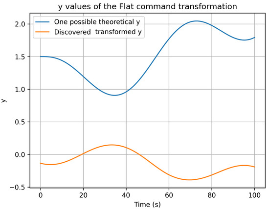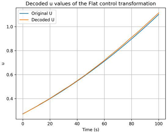 The flat control produced by our autoencoder is shown in Figure 4 along with the one proposed in Equation (7) and previously reported, which we will be naming as . The functions shown in Figure 4 are different, but both them verify all the flat control constraints. The difference is due to the fact that the neural architecture considers u and as inputs for generating y, while the analytical expression of the flat control only involves and .