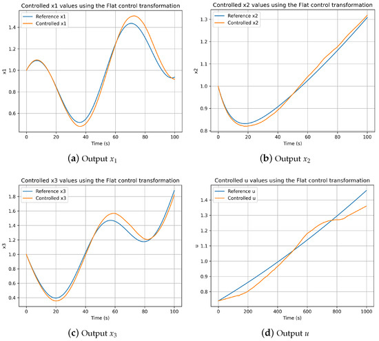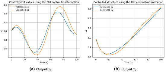 Thus, with expressed from according to Equation (7), with and implying its time derivatives, with the reference trajectory given, and with the coefficient as known, v becomes fully explicit from Equation (9). Finally, by using , the control becomes fully defined. The only critical point is the discovery of a flat output function y.