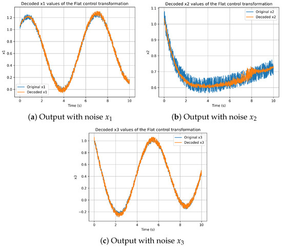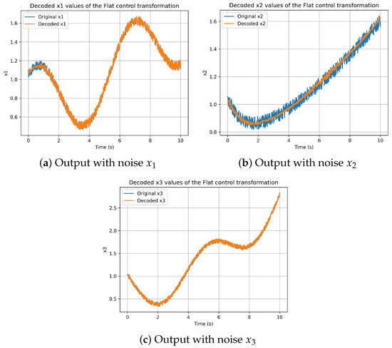 The proposed algorithm was tested against noisy data, where a white noise of maximum amplitude was added to . The noise was generated using Python’s numpy random function. The architecture proposed in Section 3.1.3 was trained using the noisy data. Figure 10 illustrates the results of the Koopman training on the noisy data using a training sample, while Figure 11 illustrates the results on a testing sample. It can be noticed that the algorithm did not find major difficulties to learn the dynamics in a very convenable way, with an appreciable filtering seen in Figure 10b and Figure 11b.