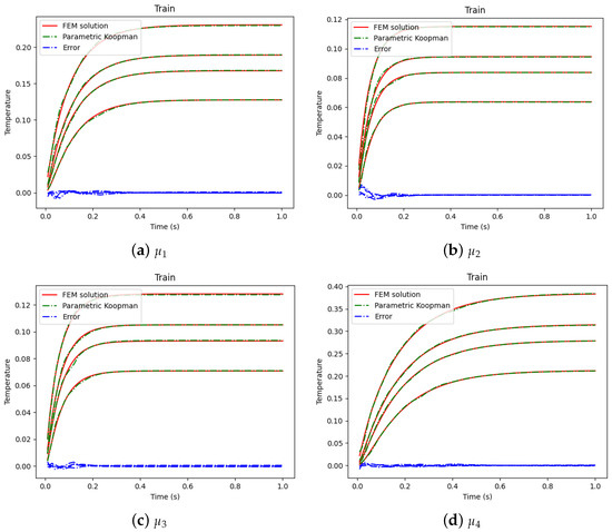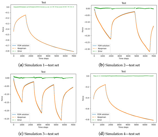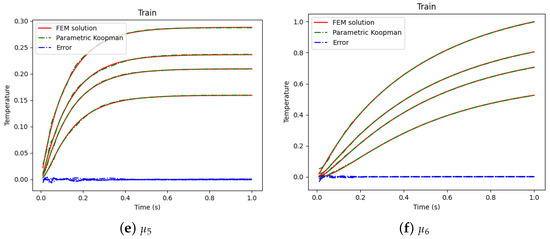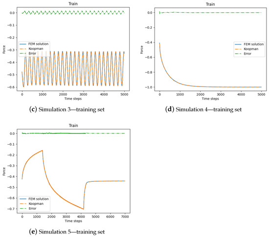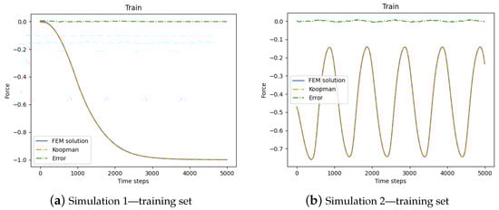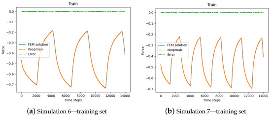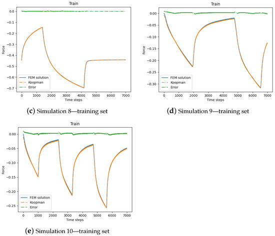 Figure 8 shows the results on a sample selected from the training set, with and . It can be noticed that for every output , the reference inputs and were provided to the algorithm, which is the usual control procedure. The results revealed excellent performance of the Koopman operator approach for updating from the known and .