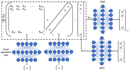 The fact that the Koopman operator is defined as a sum of separated variables helps in creating a parsimonious neural network, where at each enrichment iteration j, the previously trained networks for and , are set to nontrainable with their weights fixed, and the two new networks and are trained to minimize the loss function. When training at iteration j, the networks and are trainable. Figure 16 illustrates the parametric Koopman operator.