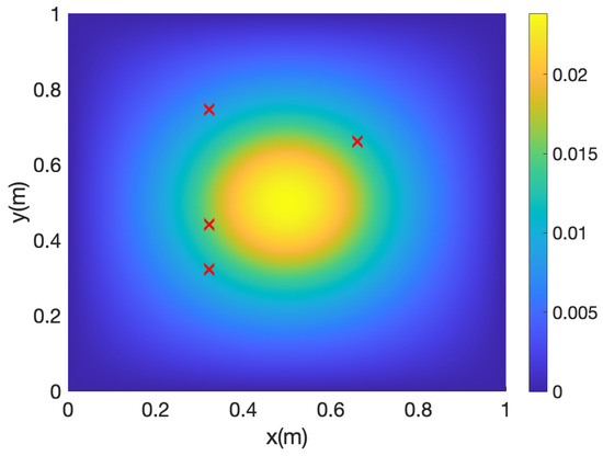The problem is first solved using the finite elements method—FEM—in for each discrete value of . Four nodes are then selected, and their temperature time evolution are recorded. The location of the virtual sensors and the temperature solution for a selected heat source and time step is illustrated in Figure 17.