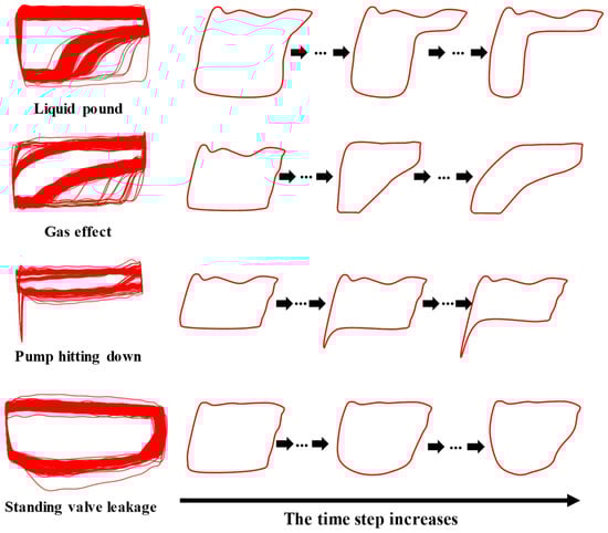 During normal production, the working conditions are usually stable. When there is an abnormality, the shape of the down-hole dynamometer cards will change gradually. When the change reaches a certain degree, it will be labeled as a fault. The working condition changes of some wells are shown in Figure 1.