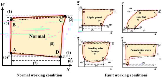 In Figure 2, S represents the displacement, and W represents the load. In addition, A, B, C, and D represent the traveling valve closed point, standing valve open point, standing valve closed point, and traveling valve open point, respectively. It can be seen that the basic shape of the down-hole dynamometer cards was determined by the load and displacement change of the valve opening and closing points. Based on these, other key characteristic parameters can be obtained to describe different working conditions further. The detailed names are as follows, and the serial numbers are consistent with those in Figure 2.