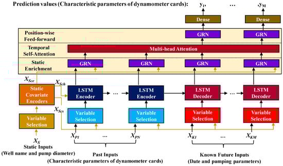 Based on the above analysis, the model should have the following two functions. First, it can achieve sequence-to-sequence prediction and learn the sequential internal relationships. Second, it can effectively fuse historical characteristic parameters and supplementary features. Bryan Lim et al. (2020), from Google, proposed the Temporary Fusion Transformers (TFT) [], which combine the advantageous strategies of existing time series prediction research and can meet the need for parameter prediction in this paper. The main structure of the model is shown in Figure 4.