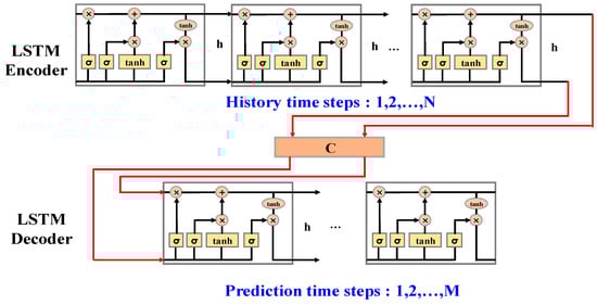 It can be seen that because the Encoder is composed of N LSTM units, it is possible to learn the sequence internal relationship of the N historical time steps of data as input. The output vector of the Encoder is C, which is also the input of the Decoder. The Decoder consists of M LSTM units corresponding with prediction time steps, which enables learning the internal relationship of predicted sequences. This method meets the demand for many-to-many time series prediction in this paper.