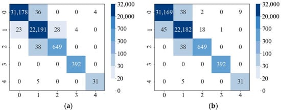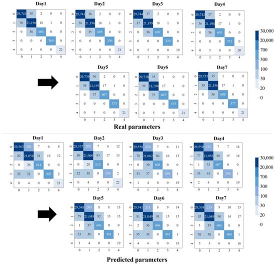 In addition, the Precision values and the Restored rates of the standing valve leakage were generally low within the prediction interval. The classification results are shown in detail in the confusion matrixes (Figure 16) within a 7-day prediction.