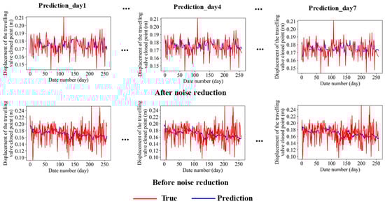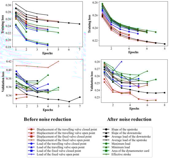 It can be seen that the loss of each parameter on the validation set was lower than that without noise reduction. Before noise reduction, due to invalid high-frequency data, the model overfitting was severe, resulting in poor prediction performance on the validation set. In addition, after noise reduction, the number of epochs was larger before the loss of the validation set increased, which made the model training more complete.