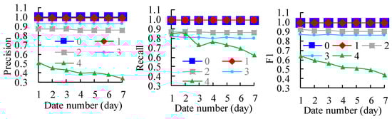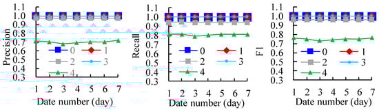 The working conditions of the next seven days for each well could be predicted by inputting the characteristic parameters into the classification model. In this way, a short-term working conditions warning method can be achieved. Within 7 days, the comparisons of working conditions warning results, including Precision, Recall, and F1 value, based on real and predicted parameters is shown in Table 10, Table 11 and Table 12, respectively.