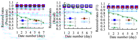 In order to compare the differences between warning and real classification results for change-over-time quantitatively, based on Figure 13 and Figure 14 and the definition of Restored rate, the Restored rates of different working conditions are shown in Figure 15.