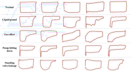 It can be seen that there were more samples wrongly classified during warning by predicted parameters than true parameters. For normal and liquid pound, samples were wrongly classified into the standing valve leakage and pump hitting down. Due to the larger number of them than in other working conditions, their down-hole dynamometer cards were more diverse as well. Therefore, some samples were not identical but similar to other working conditions that existed in them, which is shown in Figure 17.