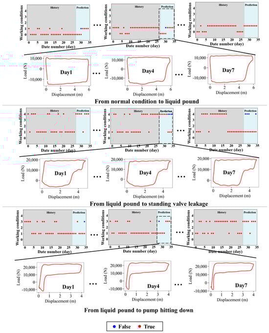 It can be seen that the unknown working conditions of the future 7 days were predicted by the samples of the past 28 days, which restored the warning process in the oilfield site. In the working conditions warning interval (28–34), most samples were predicted correctly with the method proposed in this paper when the working conditions began to change. Because the predicted results were based on the information of the past time steps, there was also a time lag in the warning process. Nonetheless, the warning results can be corrected after several time steps (usually 1–3 steps).