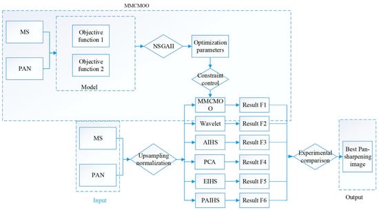 Most of the above methods choose a variety of different fusion rules, multiple different evaluation indicators, or multiple different weight parameters, but rarely choose multiple fusion models. This is mainly because it is very complicated to establish several suitable fusion models and optimize them at the same time. In addition, the values of multiple parameters of multiple models are often mutually exclusive. If the values of these parameters continue to be set manually, there will be local optimization problems. As a result, the fused image will exhibit spectral distortion. To this end, this paper proposes a multispectral pansharpening method, called MMCMOO, which combines the more advanced multi-objective optimization strategies NSGA-II [34,35] and AIHS transformation [9], to overcome the problems of multi-model missing and manual parameter setting, and further improves the fusion accuracy. In this method, the pansharpening problem of multispectral images and panchromatic images is transformed into a multi-objective optimization problem. Three different evolutionary strategies are adopted to design a variety of population generation mechanisms. The crossover operator and mutation operator in the NSGA-II algorithm are improved, and then the two models are optimized in parallel by using the improved NSGA-II algorithm. In addition, a one-step local search operator is proposed to improve the convergence speed of the algorithm.