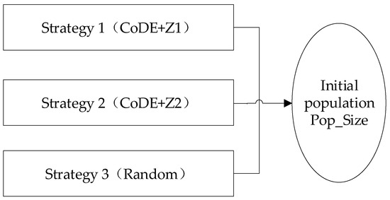 Strategy 2 (CoDE+Z2): Use CoDE algorithm to optimize Z2 model. Similarly, set the running algebra of the CoDE algorithm to 10 and the population size to . At the 10th generation, the best first chromosomes are selected as the initial population of the NSGA-II algorithm, where represents the coefficient of the population generated by strategy 2.