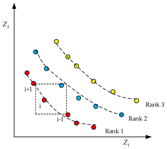 | Step 2: is defined as the first-level non-dominated set, and each individual in is marked with the same non-dominated sequence . At the same time, for each individual i in ; |