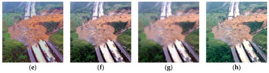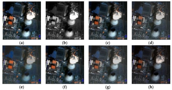 Comparison of pansharpening results (source: Google Earth). (a) Original MS; (b) PAN; (c) AIHS; (d) Wavelet; (e) PCA; (f) EIHS; (g) PAIHS; (h) MMCMOO. PAN image resolution is 256 × 256.
