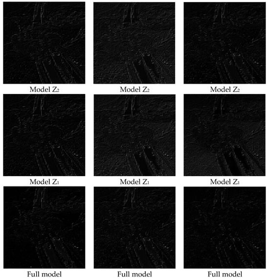 The primary contribution of the model Z1 is the incorporation of two fidelity terms, one pertaining to spectral information and the other to spatial information. The model Z2 further constrains the fidelity of the spatial resolution of the fused image. Figure 14 shows the difference map of pansharpened images obtained by different models. As illustrated in Figure 14, the difference map generated obtained by model Z1 has the most light spots, bright spots and textures, which means that the model has the most obvious spectral distortion and the most lost spatial information. Although model Z2 can retain the spectral information well, some spatial details are still missing, which is basically consistent with the conclusions of the EIHS and PAIHS methods based on single-objective optimization. The full model in Figure 14, that is, the model proposed in this paper, has the least bright spots and textures in the disparity map, which indicates that the pansharpened image obtained by it has smoother and finer spatial details and more reliable spectral information.