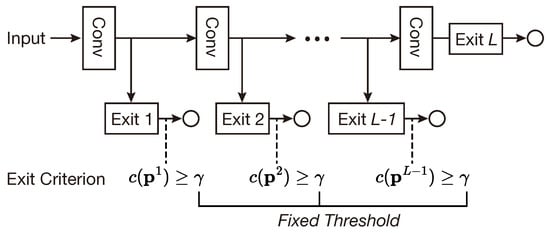 With the advancement of machine learning through extensive research, deep learning models have emerged that achieve remarkable performance in various applications []. Although these models have excellent performance across a wide range of applications [,,], they often require significant computational burdens for execution due to their complex structures. As a result, using deep learning models often poses a problem in terms of time-consuming processing and a high computational cost []. In particular, this problem is severe in computational resource-constrained environments such as mobile devices and edge computing environments [,]. To address this issue, several recent studies have focused on improving the efficiency of the inference process in deep learning models []. One such study of an early-exit mechanism [] leverages the fact that an inference using the intermediate features that can be obtained in the middle of the inference process via a deep learning model can be accurate enough as well []. Specifically, the mechanism uses an early-exit deep learning model architecture that includes one or more additional intermediate exit points, each of which can produce a model prediction using the intermediate features at the exit point. As input data propagate through the model and arrive at each exit point, the model prediction is returned, and the mechanism determines whether to exit early with the prediction using an early-exit criterion.