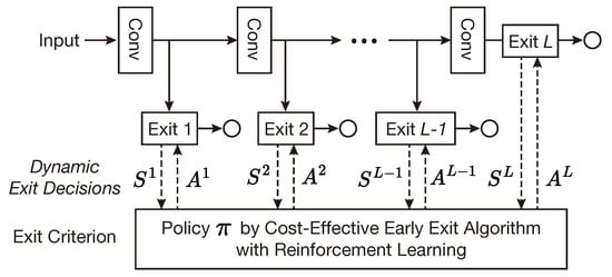Here, we consider a typical deep Q-network (DQN) method with experience replay and a target Q-network rather than traditional reinforcement learning methods such as Q-learning and SARSA, due to their computational issues with complex systems []. It is worth noting that we use the DQN, a well-known deep reinforcement learning method, but any other deep reinforcement learning methods can also be used. The DQN method can find the optimal policy by approximating the optimal state-action value function , even without any prior information on the transition probabilities. It stably and efficiently trains a neural network to approximate across the continuous state space thanks to the representational capability of the neural network. Although the DQN method does not theoretically guarantee learning the optimal policy , it has been widely shown that the DQN method typically converges to the near-optimal performance []. We refer the readers to [] for details about DQN. First, the algorithm trains a cost-effective early-exit policy, and then, the trained policy is used for early-exit decision-making to implement a cost-effective early-exit architecture as in Figure 2.