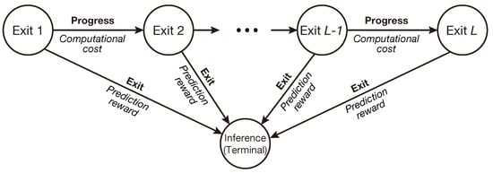 To address such dynamic decision-making as in the early-exit deep learning model, Markov decision-making (MDP) can be used. MDP provides a mathematical framework for modeling sequential decision-making to achieve a specific goal, where the environment has different states and actions []. It has been widely used to address decision-making problems in various applications, from recommendation systems [,] to communication networks [,]. The early-exit decision-making in early-exit models is sequential because of the nature of deep learning models. Specifically, in the inference process of a model, the input features propagate in a forward direction, passing through each layer of the model sequentially []. Therefore, MDP can be used for dynamic decision-making in early-exit models to balance the trade-off between accuracy and costs.