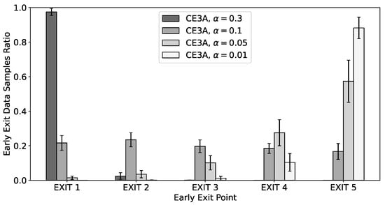 For further investigation of the behavior of CE3A, we provide the ratio of the number of data samples that have exited at each exit point by CE3A according to the penalty in Figure 4. From the figure, when the penalty is excessively large, we can see that CE3A exits most data samples at the first exit point to avoid the penalty. As the penalty decreases, it becomes more forgiving of the computations up to the next exit point. This trend clearly shows that CE3A can address the trade-off between accuracy and computational costs in the early-exit model.