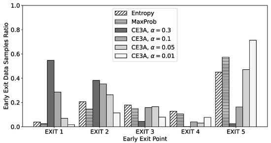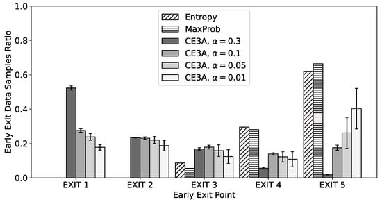 We provide the ratio of the number of data samples that have exited at each exit point in Figure 5 to further investigate the results. The ratio of Entropy and MaxProb is not provided for the different penalties since their early-exit decisions are not affected by the penalty . First, Entropy and MaxProb decide to similarly exit most data samples at exit points 4 or 5 due to their thresholds, which ensure high confidence in predictions. On the other hand, the behavior of CE3A highly depends on the penalty. The overall trend of CE3A in the real dataset environment is similar to that in the toy example environment; when the penalty is large, CE3A favors the exit points near the input layer; otherwise, it favors those near the final layer. However, when we examine it in more detail, we can see that a significant proportion of data samples exit at the exit points near the input layer (e.g., exit points 1 and 2), even if the penalty is sufficiently small (e.g., 0.01). Furthermore, the accuracy of CE3A does not deteriorate, as presented in Table 3, despite such early-exit decisions being near the input layer and the quite low average accuracies at the exit points. This happens because each sample in the real dataset has different characteristics (e.g., how easy to predict it is). Indeed, in image classification, some samples can be easily classified only using feature extraction with a low effort, while some samples cannot []. Hence, this result demonstrates that CE3A makes its early-exit decisions adaptively considering the characteristics of each sample. From those results using the real dataset, we can see that CE3A can effectively address the trade-off between accuracy and cost in practice by determining early exit adaptively to each sample.