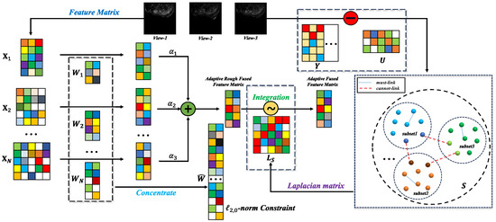 Joint multi-view unsupervised feature selection and graph learning (JMVFG) [25] is an approach based on orthogonal decomposition. Given multi-view data feature matrices and initial similarity matrices , JMVFG decomposes into view-specific basis matrices and a view-consistent cluster indicator matrix . Moreover, the unified similarity matrix is adaptively constructed with the mutual collaboration of the global multi-graph fusion to ensure the cross-space locality preservation mechanism. On the whole, the objective function of JMVFG can be formulated as follows:
