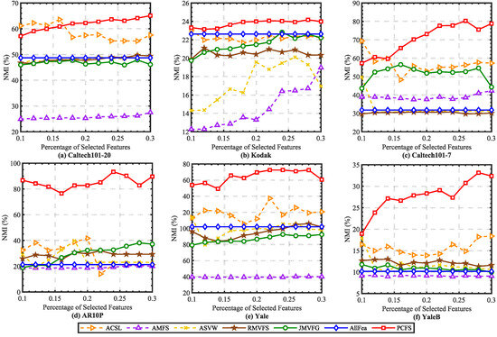 Furthermore, we show the scores of evaluation metrics of different multi-view feature selection methods on six real datasets when the percentage of selected features in Table 3. The proposed method obtained the highest ACC and NMI scores in most cases. Moreover, we utilized Student’s t-test to verify the statistical significance of the results. The symbols “*” and “†” indicate significant improvement and reduction in PCFS over the corresponding baseline method, respectively, with . On Kodak, Caltech101-20, and Caltech101-7, as shown in Table 3, PCFS had a slightly lower evaluation score than ACSL when . However, as Figure 2 and Figure 3 show, with the increase in r, the evaluation score of PCFS exceeded that of ACSL, and the result was more robust than that of ACSL on the whole. The results of the Student’s t-test also show that the improvement in PCFS compared with ACSL was significant when r varied in the region of 0.1 to 0.3. Overall, the robust and high performance of PCFS is fully demonstrated in Table 3 and Figure 2 and Figure 3.
