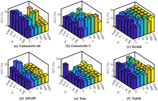 First of all, let us theoretically discuss the effects of the parameters , and . represents a constant that sets weights for the edges between instances that must be linked. As the connectivity of the graph is independent of the edge weights [31], the value of has no direct impact on our model’s performance. With regard to , it has been established that a sufficiently large guarantees that is an ideal similarity matrix, and how large the value of is considered enough needs to be discussed further in the experiments. Considering , as , the pairwise constraints regularization term approaches zero infinitely, and all cannot-link constraints will be satisfied. However, too strict cannot-link constraints regularization will lead to very meticulous spectral clustering results, and it may be more difficult to select important and vital features, which affects the accuracy of the following k-means clustering with selected features. Therefore, should be appropriate, i.e., neither too small nor too large.