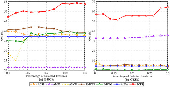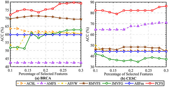 The experimental setting was kept consistent with Section 4. By using the selected features to predefine the cluster center, we obtained the performance of each method on the multi-omics cancer datasets. According to the average ACC and NMI scores shown in Figure 6 and Figure 7, our proposed method achieved excellent performances on these two datasets. It should be noted that for the BRCA dataset, we preprocessed the original dataset with the -norm, while the CESC dataset was preprocessed with the -norm. With either preprocessing method, the proposed method showed robust and excellent performances on both two datasets. More details are directly shown in Table 5.