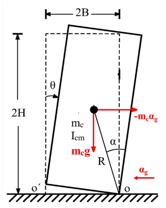 where denotes the rocking rotation, the upper (+) and lower (−) signs specify the rocking response around the right () and left () pivot points, represents the ground acceleration, g is the acceleration of gravity, is the slenderness, and p is the frequency parameter of the block, which is defined by Equation (2):
