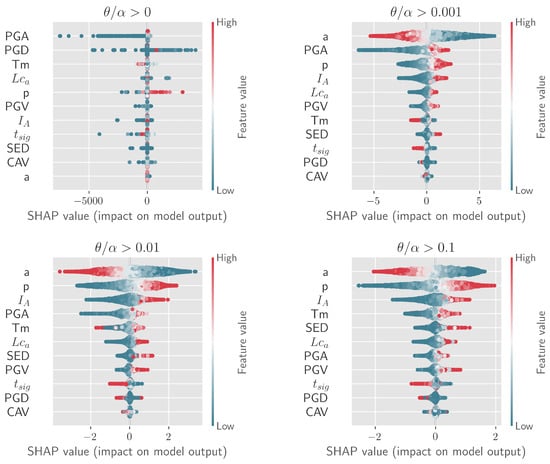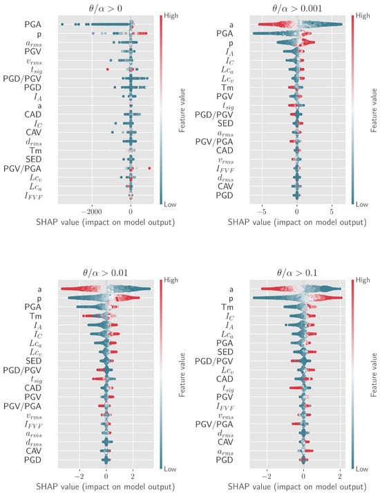 The features’ SHAP values of the four models trained with subsets of different lower bounds of the target variable are presented in Figure 5. The feature importance considering the whole dataset () results in misleading observations since the dataset is dominated by slightly uplift cases () where the freestanding block practically does not rock. Thereby, parameters with known weak correlation, such as PGD, emerge as features of major importance. However, neglecting these cases, the importance of reasonable features emerges. Moreover, the well-known scale-size effect can be observed. Specifically, as the size of the freestanding block increases (small values of p), the response becomes more stable, and vice versa. Indeed, small values of p negatively impact the response (small rocking rotations), while larger values of p result in positive SHAP values. The same remarks regarding the scale-size effect can also be derived considering the frequency content of the seismic signal (). Finally, Figure 3, in conjunction with Figure 5, demonstrates the benefit of presenting the SHAP values on the logit of the response.