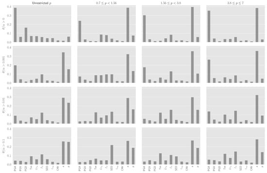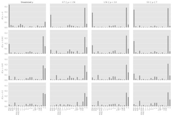 The normalized mean absolute SHAP value plots of the 16 models are depicted in Figure 4. The effect of the lower bound of the target values on the feature importance is effectively the same with only minor variations, regardless of the restrictions of the frequency parameter p. Among the examined features, only the importance of PGA is noticeably decreased as the lower bound of the rocking response increases. Additionally, a well-known property of rocking response is outlined. Specifically, the effect of PGA on the rocking response tends to decrease as the size of the freestanding block increases []. Moreover, the importance of frequency parameter p is minor if datasets of rocking blocks of restricted sizes is the case, and its importance vanishes when examining small blocks. Finally, the normalized mean absolute SHAP values of the remaining IMs do not present a distinguished trend among the different subsets.